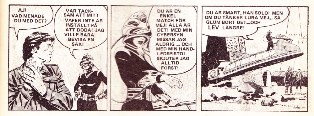 Förutom Stjärnornas Krig innehåller numret serier med Kerry Drake – Bröllopsbesvär del 2 och Buzz Cooper – Heroinsmugglarna del 2. På brevsidorna, eller Klotterplanket – Fritt Forum För Fräscha Fartiga, Fräna Funderingar blir det riktigt intressant. Här kan vi läsa en helsida dedikerad till Antirasism och Antifascism signerat ‘Anti BBS’ och på nästa sida finns en insänare från ‘Ralle’ som tipsar om rehabiliteringshemmet Narconon i Eslöv. Narconon visade sig senare drivas av Scientologerna så ur askan i elden för Ralle där. Hoppas det gick bra till slut, även om jag misstänker att Ralle bara är ett av L. Ron Hubbards alias. Tunga saker uppblandat med roliga historier och brevkompissökande 12-åringar ger en inte helt oskyldig bild av 80-talet.