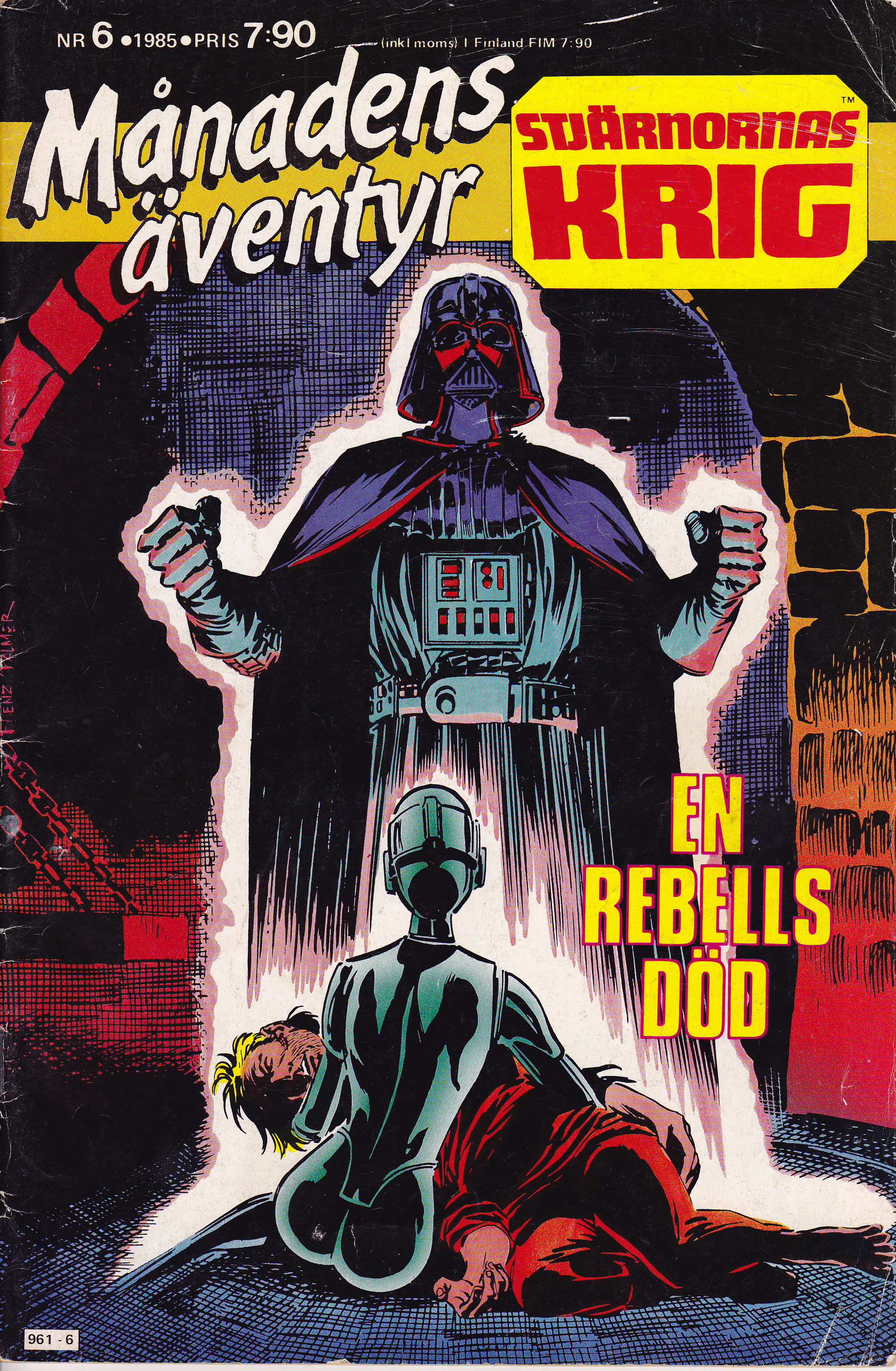 Ok, vidare till den andra serien i tidningen – En Rebells Död! Det är den här historiens originalomslag av Palmer och Frenz (Star Wars #80) som fått pryda den svenska utgåvan. Snyggt! Det ger oss många ledtrådar (och några frågor). Den första ledtråden står ju i klartext, en rebell dör! Spoiler! För det andra, Darth Vader verkar vara den som bragt rebellen om livet. Mäktigt. Och till sist verkar historien handla om en robot med välsvarvad, päronformad bak.