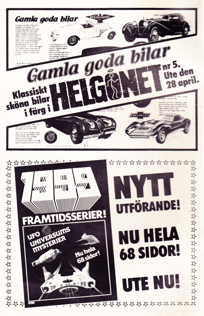 På förstasidans insida hittar vi ett par annonser. Först en märklig en för Serietidningen Helgonet. Det verkar som om Helgonet skjuter in sig på den bilintresserade delen av potentiella tidningsläsare. Innehåller den en faktadel om bilar? Jag vet att jag läste lite helgonen när det begav sig, men jag kommer inte ihåg att det delvis var en ‘bil-tidning’. Den undre halvan är en reklam för en tidning som heter 1999 -Framtidsserier (bara 18 år kvar till framtiden! Psyched!) Jag vet inte om tidningen har tagit namnet från, eller har någon koppling alls till TV-Serien Space 1999. Den hette som ni kanske kommer ihåg Månbas Alpha här i sverige och sändes 1976 och 77 på SVT.