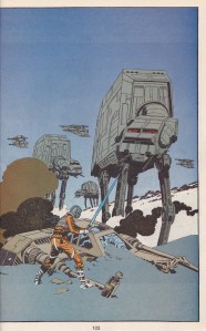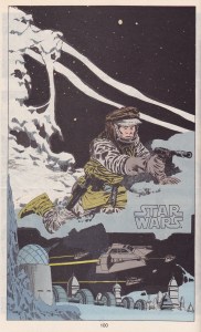 Som ni kanske vet så håller jag just den här serien, Rymdimperiet Slår Tillbaka som bland det absolut bästa Star Wars som utgivits. Al Williamsons tekningar är fantastiska och serien innehåller konstverk på konstverk. Förutom att bilderna fått ny färgläggning så har serien faktiskt fått några nya serierutor också! Ni minns när Han Solo så listigt gömmer Tusenåriga Falken i avfallet från en Stjärnkryssare, den sekvensen har snyggats till här och så har två stora helsidespaneler stoppats in. Den ena är ett återanvänt lösnummeromslag. Den andra som du ser här nedanför är mer av ett mysterium. Har Williamson ritat den? Det ser så ut. Men varför är den då inte med i albumet från 1980? Märkligt, men härligt att se.