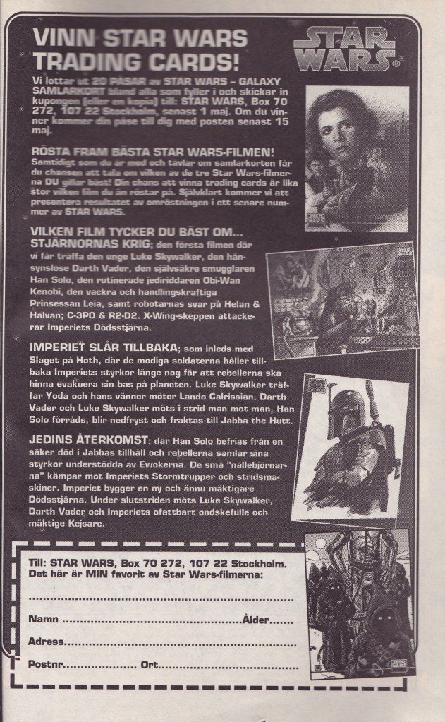 På redaktionssidan uppdaterar ”Janne the X-Wing Rookie” oss om hur förproduktionen av Episod I fortlöper och meddelar att den svenska biopremiären av Star Wars Special Edition är satt till den 21 mars 1997! Lagom till 20-års jubiléet. Janne lovar också att om du skriver in med dina Star Wars-frågor och funderingar så kan du raka hem ett paket med ”Tradig Cards”! Annars gick det ju bra att vara med i utlottningen på sidan innan med chans att vinna samma kort. Det är Star Wars Galaxykort (filmisar som de kallades i tidernas begynnelse) från Topps.