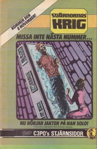 Här ovanför är omslagen till de amerikanska utgåvorna, nr 62 och 63. Det första är av Walt Simonson och det andra av Tom Palmer. I det svenska numret har det hittils alltid varit uppdelat i två tydligt separerade delar med kapitelnamn men i det här numret är det inte så. Efter C3P0’s Stjärnsidor fortsätter äventyret ganska sömlöst. Stjärnsidorna innehåller för övrigt den första delen av redaktörerna Sparring och Hammarströms Star Wars – Lexikon. Eftersom den här bloggen inte avhandlar tidningara kronologiskt så har vi ju kikat på det här lexikonet förut i ett Månadens Äventyr men det här är början, från A till B – från A-Vinge till Boushh. Trettio år senare i en värld med hyllmeter av Star Wars lexikon så känns ju det här lite torftigt, men charmigt är det.