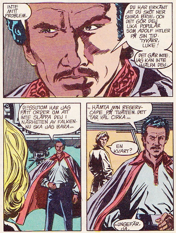 Några av pratbubblorna innehåller två knasigheter här i början. En sak som sällan blir bra i Star Wars Expanded Universe som böcker och serier är när det ska pratas om mat. Och när kantinen här serverar saker som Mån-järpar och Pluto-lassagne, ja då blir det direkt pajjigt, för att använda en mat-term. Den andra knasigheten är dum, på riktigt! På sidan 9 i ett samtal mellan Lando och Luke säger Lando följande: