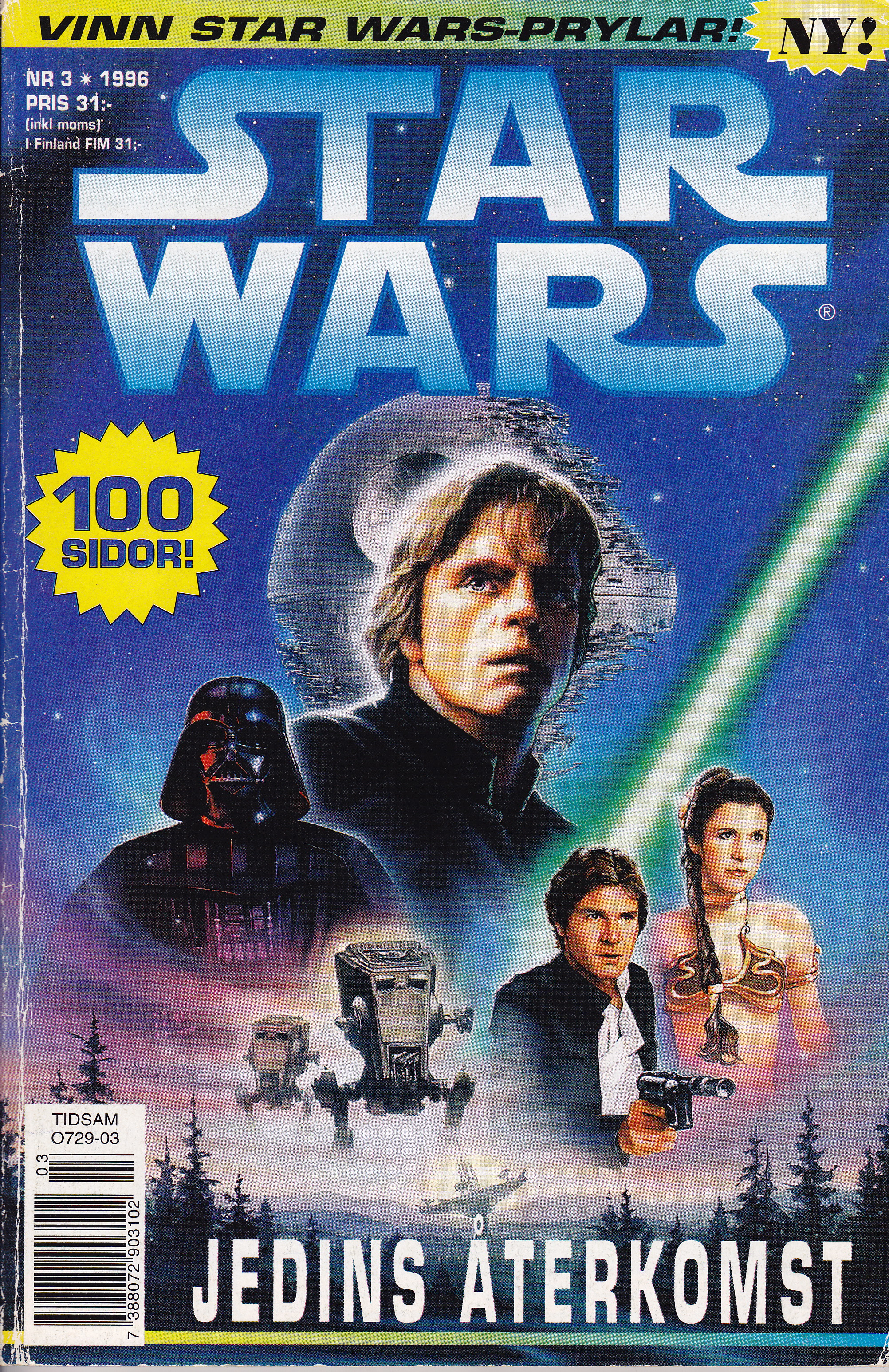 Jedins Återkomst, eller Star Wars Nr 3 som det står på ryggen är som ni säkert vet vid det här laget en gammal serie återutgiven i ny förpackning. Både Stjärnornas Krig och Rymdimperiet Slår Tillbaka har fått samma behandling. Även Jedins Återkomst här har fått en uppdaterad färgläggning, Läs krönikan om Star Wars Nr 1 1996 om du vill läsa vad jag skriver om den nya färgskalan och hur den står sig i jämförelse med förstautgåvan.
