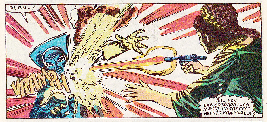 Det här är det första framträdandet för den mystiska Lumiya. Hon blir skadad här men undkommer för att slåss nya slag i otaliga serier böcker långt in på 00-talet i exempelvis bokserien Legacy of the Force. Lumiya ska så klart återkomma i de här serierna också. Mary Jo Duffy skriver in henne med jämna mellanrum under hela den återstående utgivningen av Marvels Star Wars. Den här karaktären har kommit att bli en av mina favoriter från den här eran, men då inte främst tack vare framträdandet i det här numret. Det här är en ganska sopig entré eller hur? Lumiya framstår ju inte som en mäktig Dark Lord här utan snarare som en underhuggare, ännu en veckans skurk. Och vad gör hon här på Herdessa igentligen om hon nu är en Sith? Det är en märklig introduktion och lite synd på en cool karaktär med enorm potential, men det mesta av det här tyckandet är baserat på information som vi inte kan läsa oss till i den här tidningen. I sista rutan lovar hon dock att hon ska komma tillbaka och det kommer hon sannerligen att göra, och då som vi ska se i lite ny skepnad. Men det tar vi en annan gång.