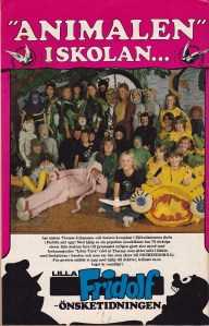 Även baksidan är en reklam för Lilla Fridolf, specifikt för Önskesidorna som tydligen har sponsrat en skoluppsättning av Tage Danielson och Lars Anders Werles musikal Animalen. Det här måste varit en grej i skolorna just vid den här tiden, den spelades även på min skola. Musikalen är så extremt mycket 80-tal. Den handlar om kalla kriget och kapprustning mellan öst och väst. Nu en bit in på 10-talet så har folk dåligt miljö-samvete och ångest för klimatförändringar men på 80-talet så var det det överhängande hotet om utplåning genom Global Thermonuclear War eller alternativt det marginellt muntrare ödet Atomvinter som deprimerade oss. Det här influerade allt, även barnens skoldag naturligtvis. Inte undra på att vi blev som vi blev.
