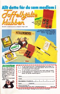 På förstasidans insida kan vi se en reklam för TV-spelet Atari 2600. Det här systemet kom redan 1977 men hette då VCS, Video Computer System. Nu, år 1984 var det här lite passé sedan det betydligt fräsigare Atari 5200 kommit. Så i ett försök att prångla ut några ex av det gamla VCS så döptes det om till Atari 2600. Så du får en konsol med två joysticks och Space Invaders för 1095:-, taget? Baksidans insida består av en reklam för Toffelhjälteklubben. En Lilla Fridolf fanclub(!?)