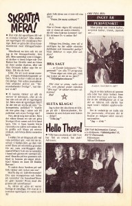 Läsarsidorna – Klotterplanket – innehåller som vanligt en mix av roliga historier, musik-toplistor och politiska kommentarer. Den här gången kommer vi in i en pågående brevväxling om de kontroversiella Löntagarfonderna. Det är inget som är värt att återge här kan jag meddela. I det här numret presenteras också Seriemagasinets Heta Linje, en sorts öppet telefonforum. Numret är 08-739 88 35, vi hörs! Jag måste också tipsa om utmärkta P3 dokumentär om Heta Linjen, en intressant liten bit närtidshistoria. Lyssna här – P3 Dokumentär.