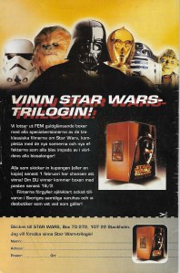 På baksidan lottas fem Star Wars VHS guld-boxar ut. Alla har väl en av de här boxarna hemma i någon variant? Själv köpte jag silver-boxen som innehåller Star Wars Special Edition i Widescreen. Är det inte lite konstigt att Widescreen ansågs vara silver och inte guld? Guld ska ju vara top of the pops! Är det hemskt elitisktskt av mig att tycka att pan & scan versioner bara är halva filmer? Det här är ett litet mysterium som jag brottas med, jag antar att det får sin upplösning någon annan gång.