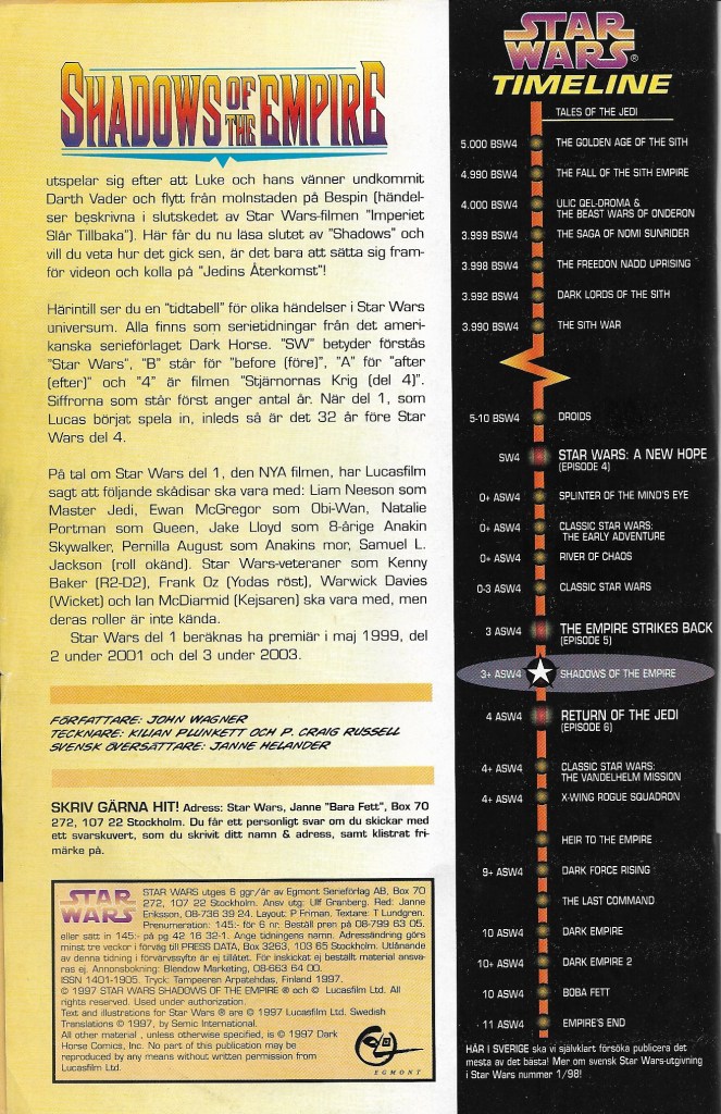 I övrigt innehåller numret bara en kort resumé på första sidan och så en tidslinje som sedemera blivit standard i Expanded Universeböcker och serier. Införandet av tidslinjen är ju en bra innovation. Det kan ju annars vara knivigt att hålla ordning på när i tiden vi hoppar in i någon av de många historierna som kom under 90-talet och frammåt. Tidslinjen kommer särskillt väl till pass när vi går in i nådens år 1998 och där vi kommer att hoppa en hel del i Stjärnornas Krig-kronologin. Den som läser den här tidslinjen noga kan notera att en hel del av titlarna inte är utgivna i sverige vid den här tiden och några titlar saknas på svenska än i dag och kommer sannorlikt heller aldrig att ges ut, varken förr eller senare heller.