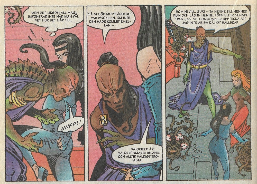 En annan sak som är nytt i och med det här numret är den svenska utgivaren. De första två numren (och alla tidigare Stjärnornas Krig-serier sedan 83) kom ut via Semic Press AB men i den här vevan sålde Bonnier av hela serieutgivningen till Danskägda Egmont, så det står Egmont Serieförlag i ditt ex av Star Wars Nr 4 från 1997. Med facit i hand kan vi konstatera att Egmont inte betydde något särskillt lyft för Stjärnornas Krig-serier i sverige, å andra sidan blev det inte direkt sämre heller – det rullar på som vanligt i några år till i allafall.